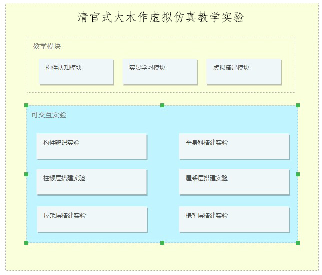清官式大木作教学的主要内容分为四部分,分别为构件认知教学、清官式建筑构造教学、古建筑现场认知踏查、营造文献阅读与整理。本实验项目从教学内容出发,针对传统教学中面临的教学资源直观性差、实物模型数量少精度低学术性差无法满足搭建需求、现场踏查成本高有风险等教学痛点,设计了本实验项目,包含如下几个模块: