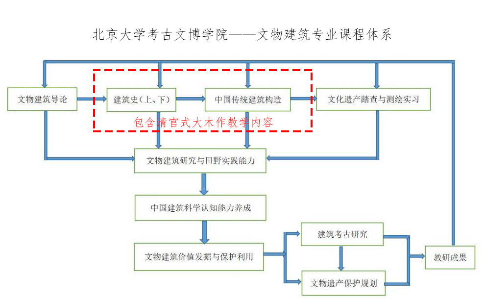 北京大学考古文博学院下设有考古学、博物馆学、文物保护、文物建筑四个本科生专业方向。清官式大木作教学内容是文物建筑专业课程体系重要的组成部分,在《中国建筑史》课程中讲授,是学生后续进行深入的文物建筑研究、建筑考古研究的知识基础。